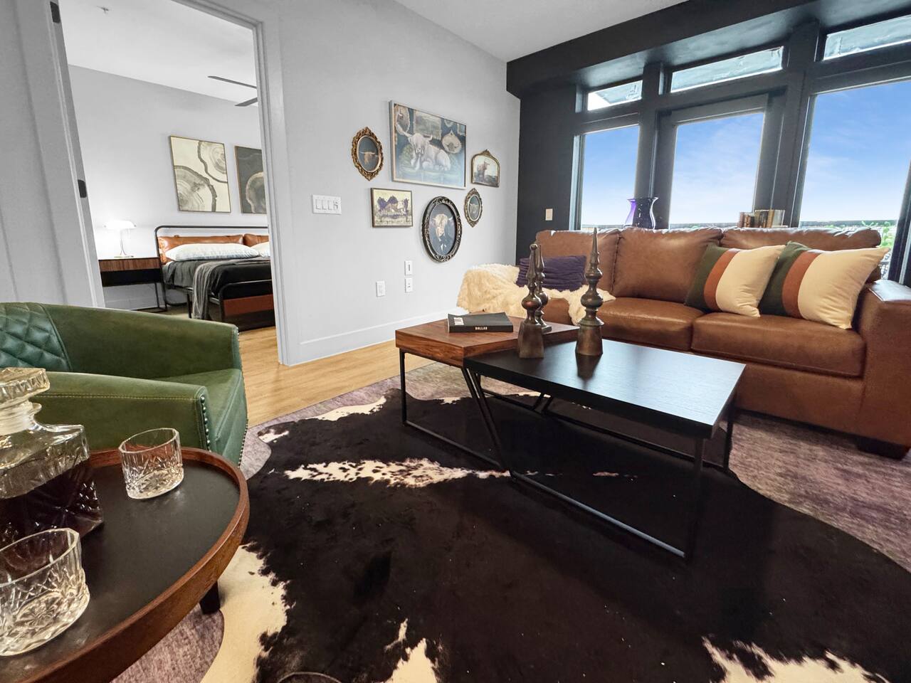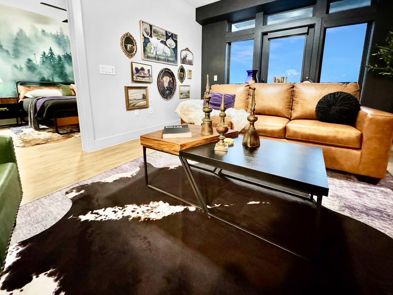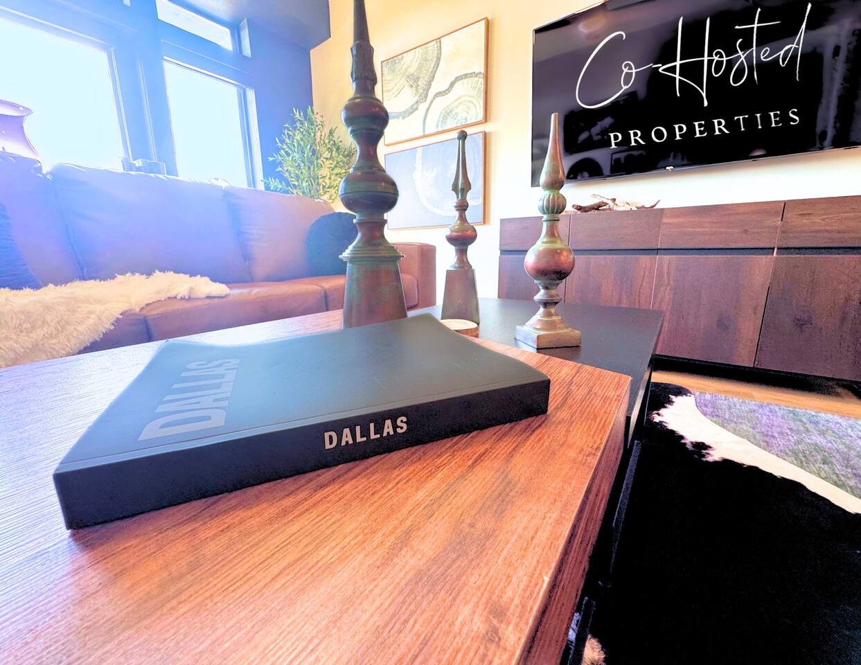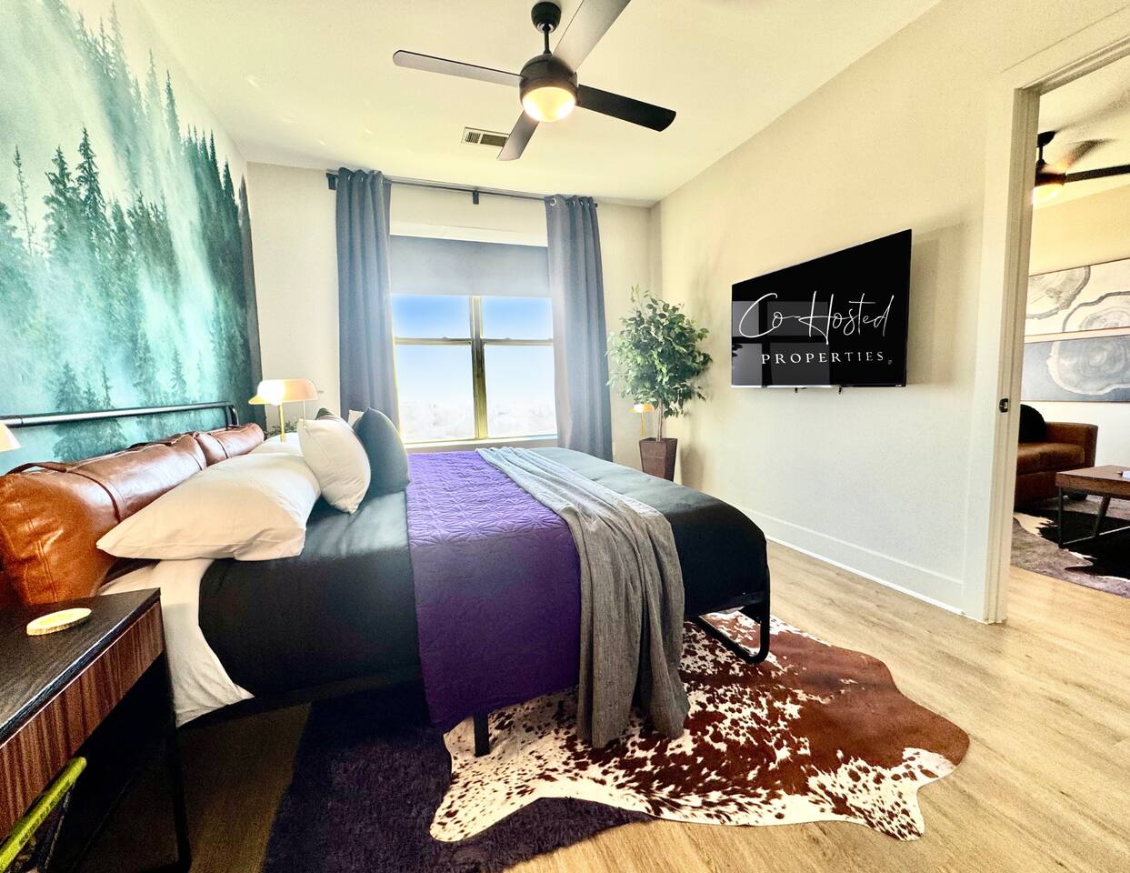 The Space Curated Decor – A fusion of mid-century modern and Texas chic, featuring rich leather seating, deep wood tones, and bold accent pieces. Spacious Living Area – Sink into the plush leather sofa or the unique emerald green armchairs while streaming your favorite shows on the wall-mounted Smart TV. Work-From-Home Ready – A cozy, library-themed office nook offers the perfect workspace with high-speed WiFi Chef’s Kitchen – Fully equipped with black cabinetry, sleek countertops, and high-end appliances, perfect for cooking or enjoying a cup of coffee from the Keurig station. Cozy Bedroom Oasis – Unwind in the king-sized bed with designer bedding, set against a striking forest mural backdrop, adding a peaceful, nature-inspired touch. Windows open and fester a black-out roller shade and blackout noise damping curtains. Spa-Like Bathroom – Featuring a walk-in glass shower, modern black vanity, and hotel-quality toiletries, and BaByliss Pro Hair Dryer. Private Balcony – Enjoy stunning city views of Reunion Tower, The Omni Hotel, The Margaret Hunt, Bridge, and The Texas State Fairgrounds, all from your outdoor seating area, the perfect spot for morning coffee or evening cocktails. In-Unit Washer & Dryer – Stay fresh with a stacked full sized washer & dryer, making long stays effortless. Why Stay Here? One Free Parking Included Secure, High-End Apartment Community Walkable to the Best of Deep Ellum Professionally Hosted by CoHosted Properties Book now and experience Deep Ellum in style, comfort, and luxury! See our other units within this amazing property.