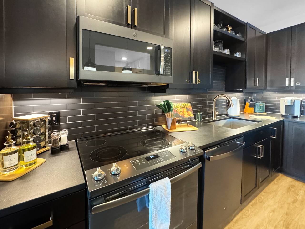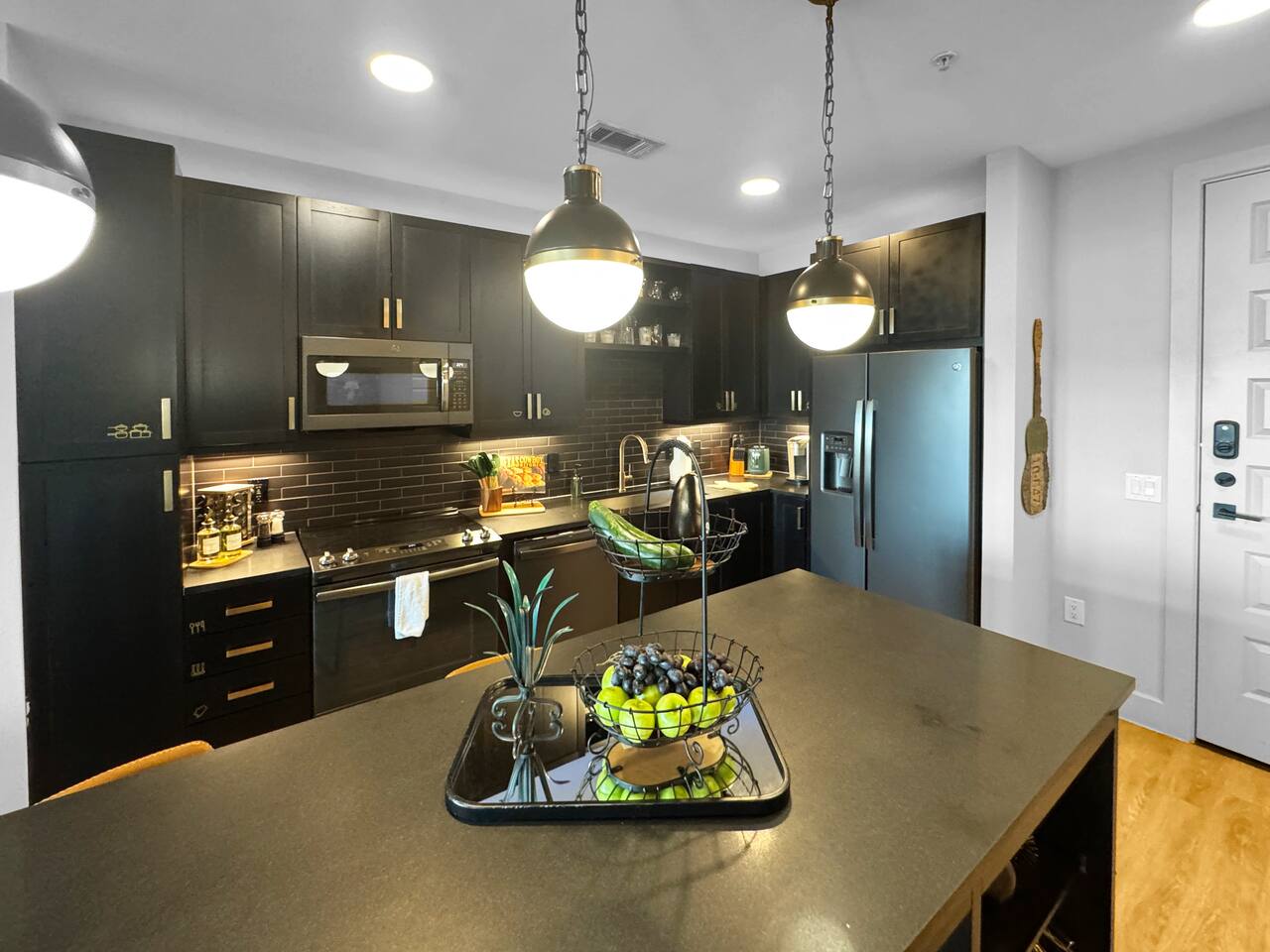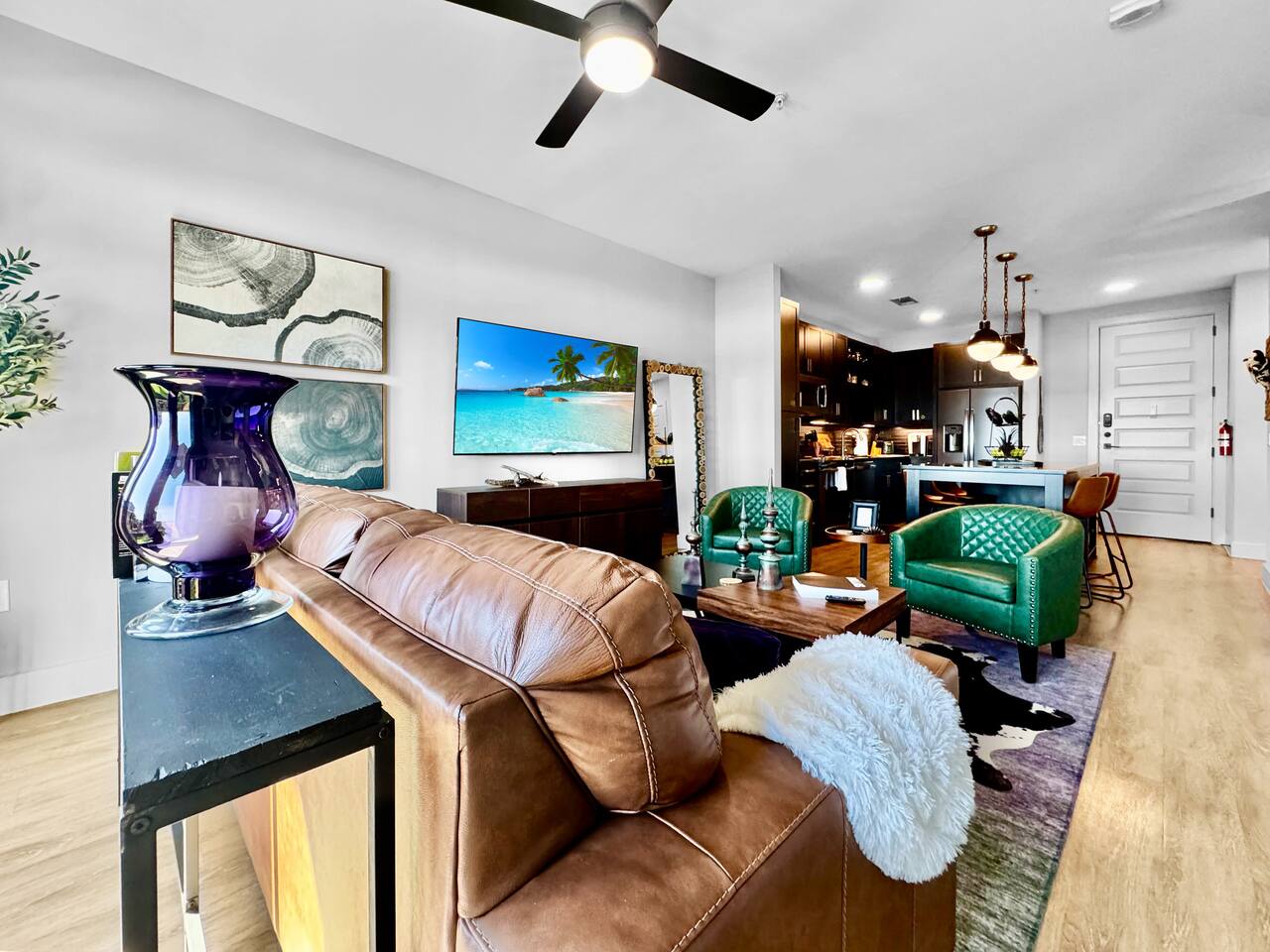 The Space Curated Decor – A fusion of mid-century modern and Texas chic, featuring rich leather seating, deep wood tones, and bold accent pieces. Spacious Living Area – Sink into the plush leather sofa or the unique emerald green armchairs while streaming your favorite shows on the wall-mounted Smart TV. Work-From-Home Ready – A cozy, library-themed office nook offers the perfect workspace with high-speed WiFi Chef’s Kitchen – Fully equipped with black cabinetry, sleek countertops, and high-end appliances, perfect for cooking or enjoying a cup of coffee from the Keurig station. Cozy Bedroom Oasis – Unwind in the king-sized bed with designer bedding, set against a striking forest mural backdrop, adding a peaceful, nature-inspired touch. Windows open and fester a black-out roller shade and blackout noise damping curtains. Spa-Like Bathroom – Featuring a walk-in glass shower, modern black vanity, and hotel-quality toiletries, and BaByliss Pro Hair Dryer. Private Balcony – Enjoy stunning city views of Reunion Tower, The Omni Hotel, The Margaret Hunt, Bridge, and The Texas State Fairgrounds, all from your outdoor seating area, the perfect spot for morning coffee or evening cocktails. In-Unit Washer & Dryer – Stay fresh with a stacked full sized washer & dryer, making long stays effortless. Why Stay Here? One Free Parking Included Secure, High-End Apartment Community Walkable to the Best of Deep Ellum Professionally Hosted by CoHosted Properties Book now and experience Deep Ellum in style, comfort, and luxury! See our other units within this amazing property.