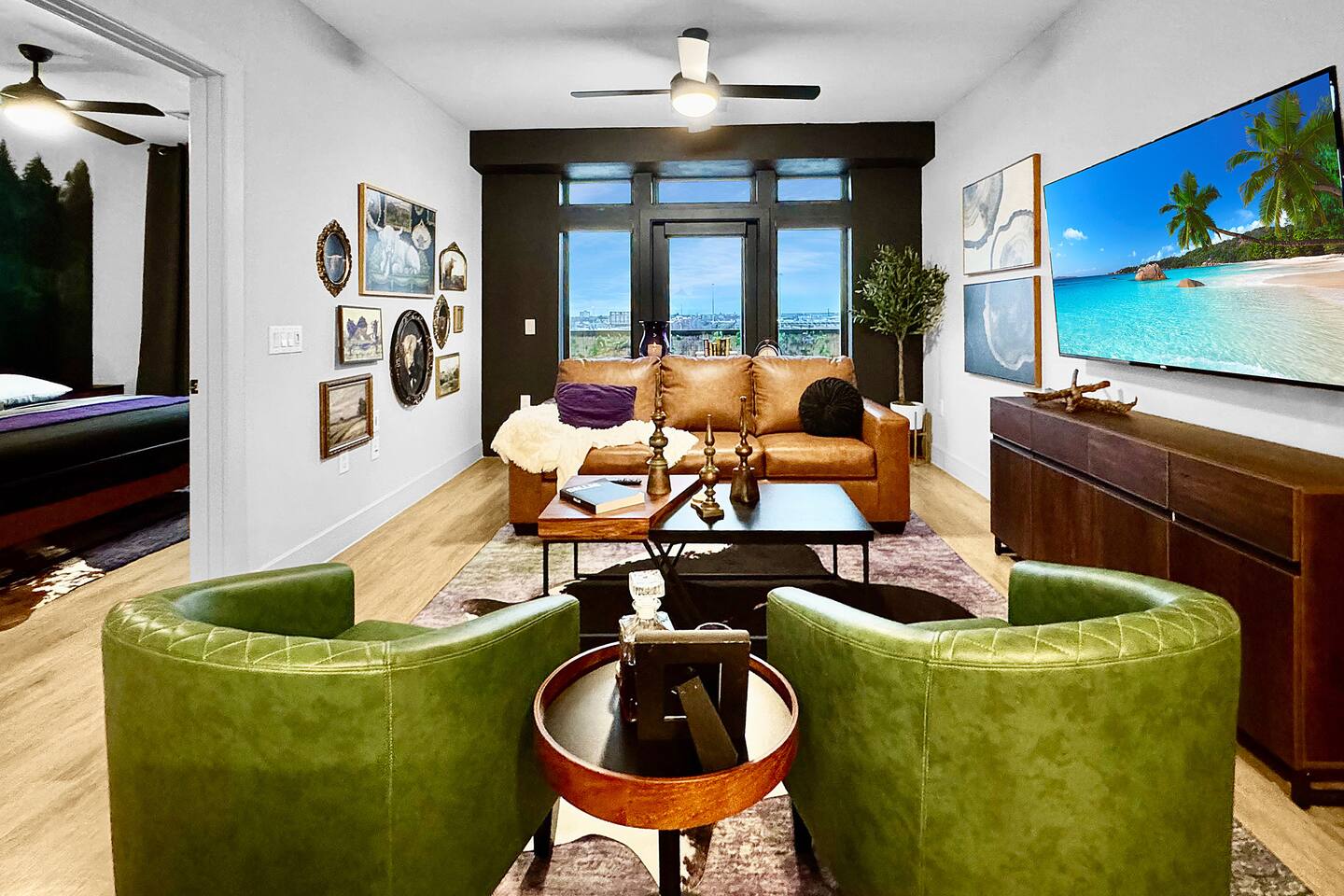 Discover the perfect blend of modern elegance and artistic charm in this stunning one-bedroom apartment at Indie Deep Ellum. Thoughtfully designed for the style-conscious traveler, this high-end retreat boasts expansive city views, bold statement décor, and luxurious comforts. Whether you’re here for business or leisure, you’ll be immersed in Deep Ellum’s vibrant energy, surrounded by renowned music venues, top-rated restaurants, and eclectic art galleries.